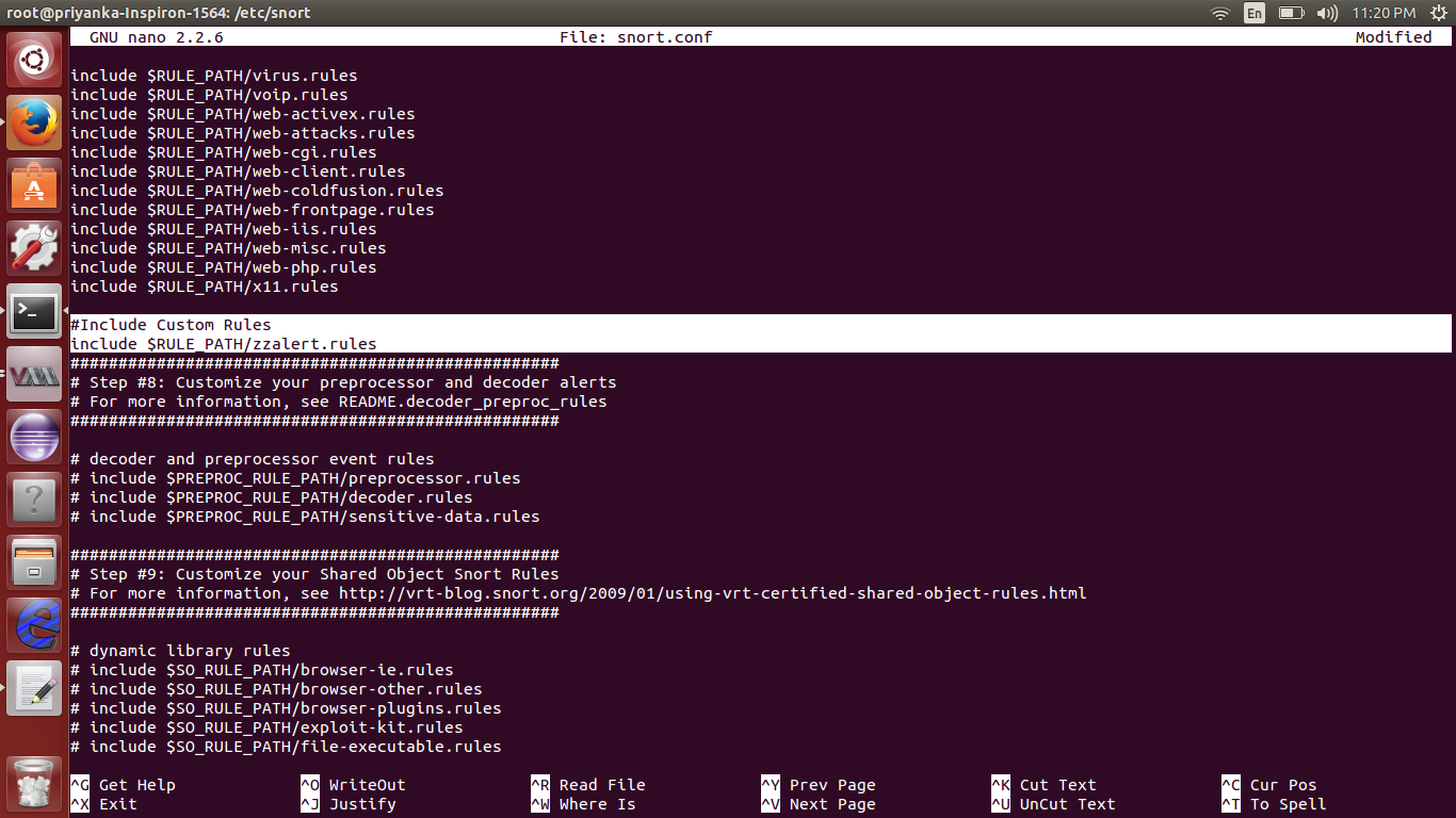 - Create your custom rule by running the command "sudo pico zzalert.rules". (you can give any name to your custom rule in place of zzalert.rules). A blank screen something like below will open up: